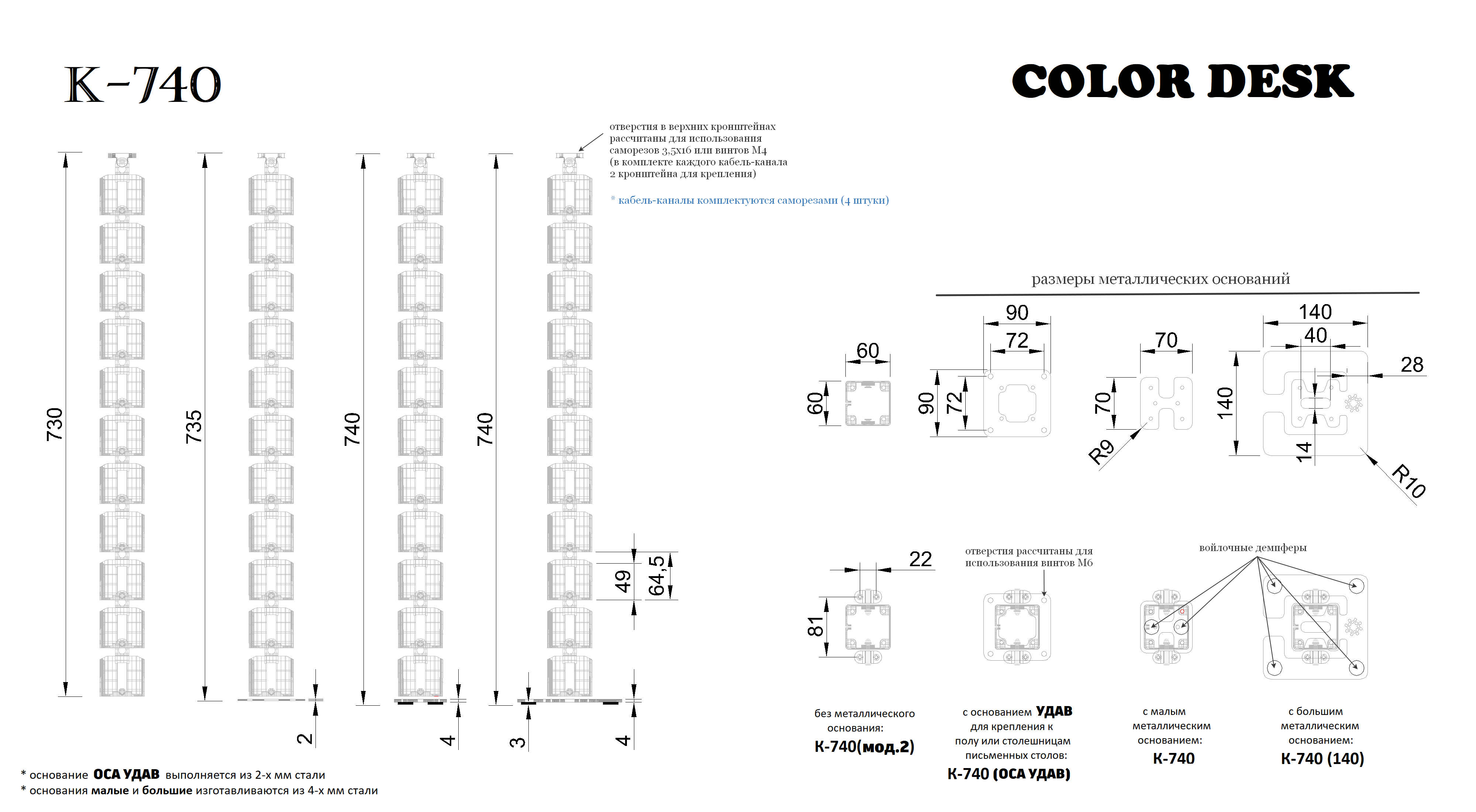 Для крепления гибкого кабель-канала к столешнице письменного стола используются 2 кронштейна, идущие в комплекте поставки со всей необходимой для сборки фурнитурой. Их хорошо видно на фотографиях в ленте. Крепление можно производить как с помощью саморезов (в комплекте поставки 3,5х16 мм 4 штуки) или же при помощи винтов М4 (не входят в комплект). Выбор той или иной фурнитуры для крепления зависит от того, к какой поверхности будет осуществляться крепление. Материал, толщина - всё это имеет значение. Саморезы 3,5х16 мм, идущие в комплекте основной фурнитуры, как правило подходят для крепления кабель-каналов к столешницам из ЛДСП с толщиной не менее 16 мм, а так же к деревянным столешницам (или элементам конструкции), толщина которых так же не менее 16 мм. Крепление на винты М4, которые не идут в комплекте, как правило сопровождается дополнительными предварительными работами по подготовке крепёжных отверстий со встроенными в них резьбовыми футорками в столешнице.