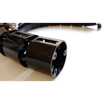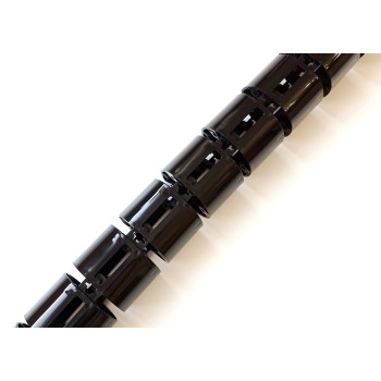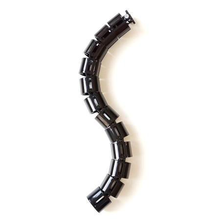 Вертикальный гибкий кабель-канал для письменных столов длиной 730 мм чёрного цвета без металлического основания-утяжелителя. К базовым (стандартным) цветам исполнения относятся: белый, серый, чёрный, графит и бесцветный (полупрозрачный). Кабель-канал состоит из 12 звеньев цилиндрической формы, соединённых друг с другом в цепочку напоминающую "хребет". Диаметр кабель-канала 68 мм. Каждое звено кабель-канала снабжено крепёжными отверстиями в нижней части, позволяющими прикрепить изделие к поверхности любого типа расположенной под любым углом (пол, стены и п.т.). Кабель-канал выполнен из первичного высококачественного пластика.