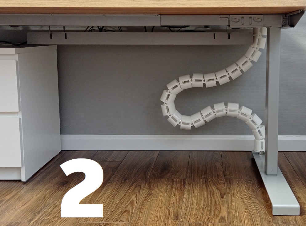 При установке кабель-канала на регулируемый по высоте письменный стол есть одна особенность - расположение прорезей для укладки проводов. Если прорези расположены во внутреннюю сторону петли сгиба, то петля сгиба будет иметь форму 1 (на фото). Если же прорези будут смотреть во внешнюю сторону петли сгиба, тогда петля сгиба получится другой формы (цифра 2 на фото). Вы можете выбрать наиболее подходящее вам положение гибкого кабель-канала. При необходимости вы всегда можете развернуть кабель-канал в нужную сторону, изменив форму его петли сгиба при опускании письменного стола.