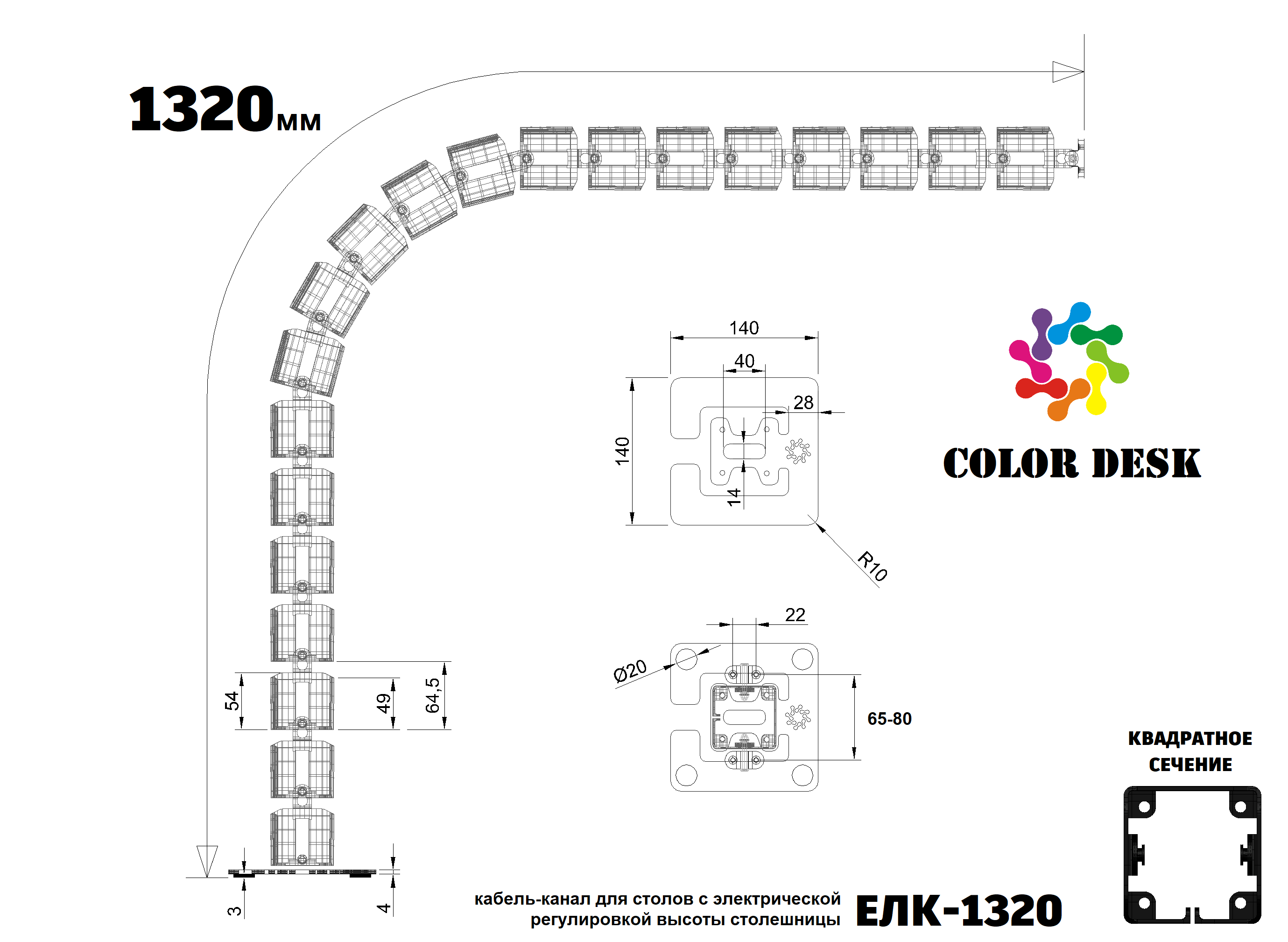 COLOR DESK EЛK-1320 это вертикальный гибкий кабель-канал, служащий для организации проводов, идущих от пола к столешнице стола, высота которого постоянно меняется в довольно широком диапазоне. Мы предлагаем своё решение для рабочих мест, оснащённых столами с электрической (или ручной) регулировкой высоты столешницы. Канал для проводов имеет квадратное сечение и состоит из 20 звеньев.