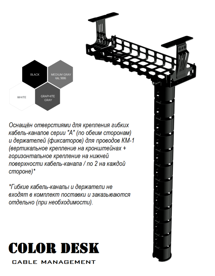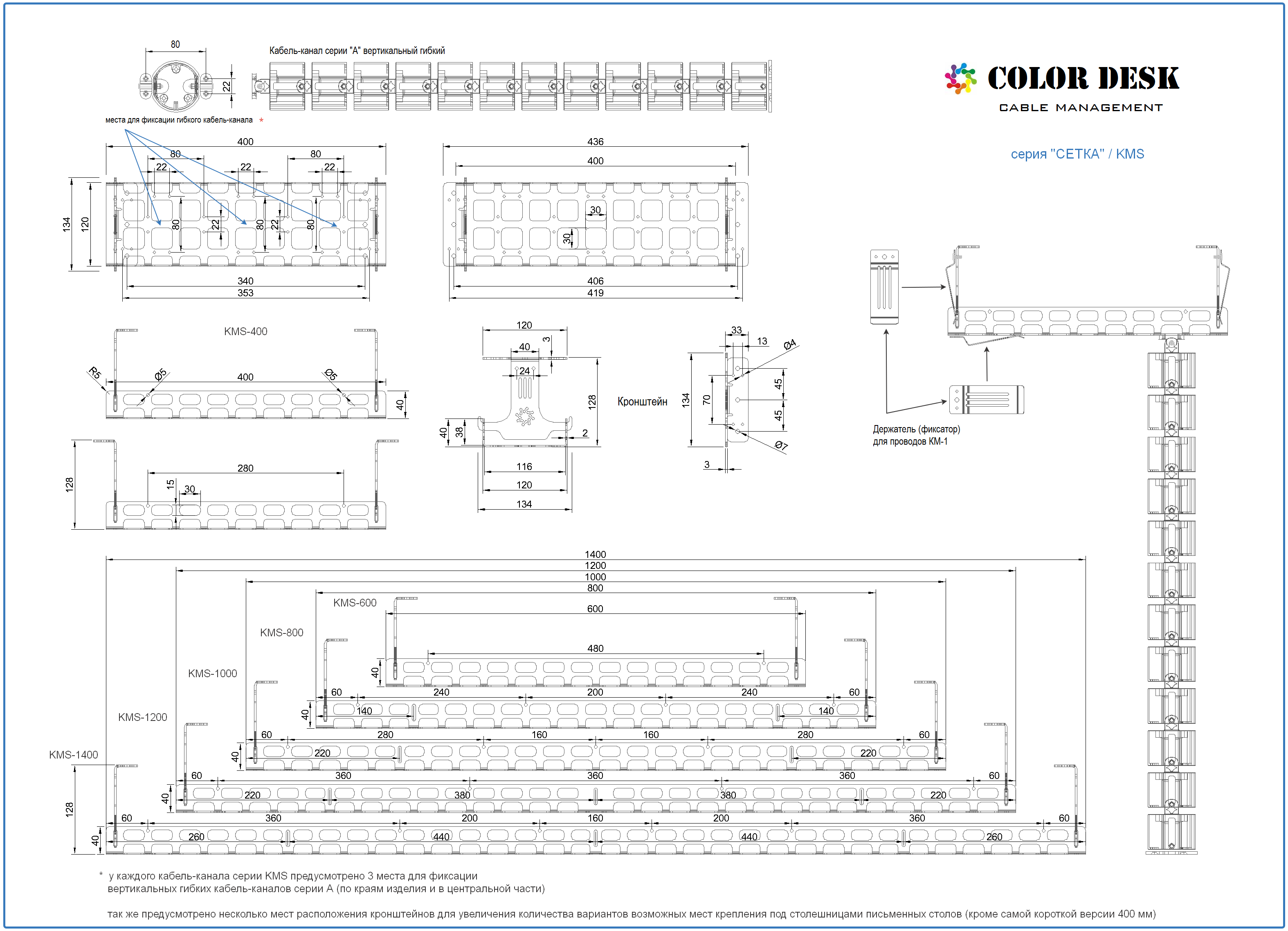 ДОПОЛНЕНИЯ. Все кабель-каналы серии KMS "СЕТКИ" имеют возможности для апгрейда или, другими словами, усовершенствования. Вместе с каждым кабель-каналом серии "СЕТКИ" могут использоваться один или несколько вертикальных гибких кабель-каналов серии "А" и один или несколько держателей (фиксаторов) для проводов КМ-1. Для гибких кабель-каналов предусмотрено по 3 посадочных места (по краям и в центральной части). Для держателей КМ-1 посадочные места есть как на основной части СЕТКИ (можно установить по 2 держателя на каждой стороне), так и на кронштейнах (на каждом кронштейне можно установить по одному держателю). Установка дополнительных аксессуаров существенно расширяет возможности и позволяет сделать рабочее место ещё более удобным и аккуратным.